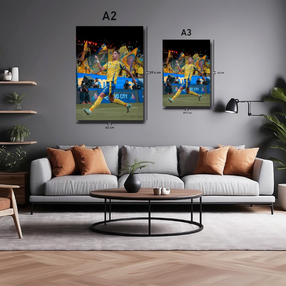 • الجودة: تتميز اللوحة بجودة عالية في الطباعة والتفاصيل الدقيقة التي تبرز كريستيانو النصر بأفضل صورة. يتم الحفاظ على ألوان اللوحة بشكل ممتاز لفترة طويلة، مما يجعلها إضافة فنية رائعة.